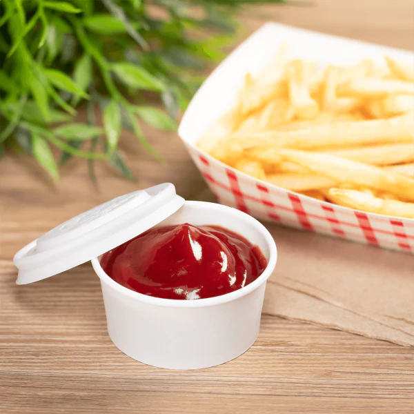 Introducing our 2 oz Eco-Friendly Paper Portion Cup! Made of recyclable paper, it's perfect for serving sauces, dressings, and condiments. Say goodbye to plastic waste and hello to an environmentally conscious solution for your food service needs.