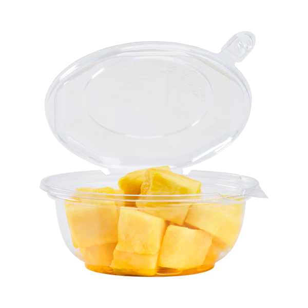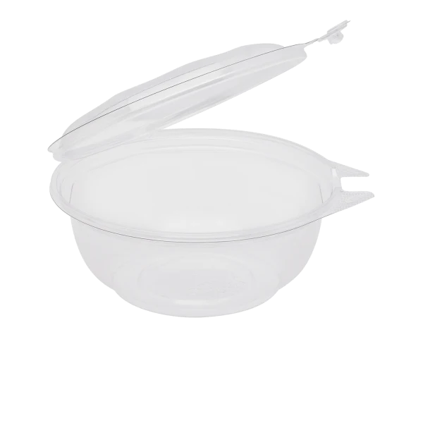 This 24 oz PET Plastic Tamper Resistant Hinged Salad Bowl with Dome Lid is perfect for keeping your salads, fruits, and more fresh and secure. The durable plastic bowl provides convenience and the hinged dome lid ensures tamper resistance. Great for on-the-go meals.