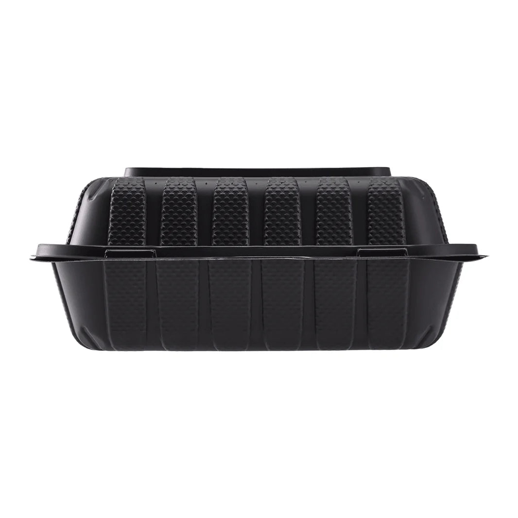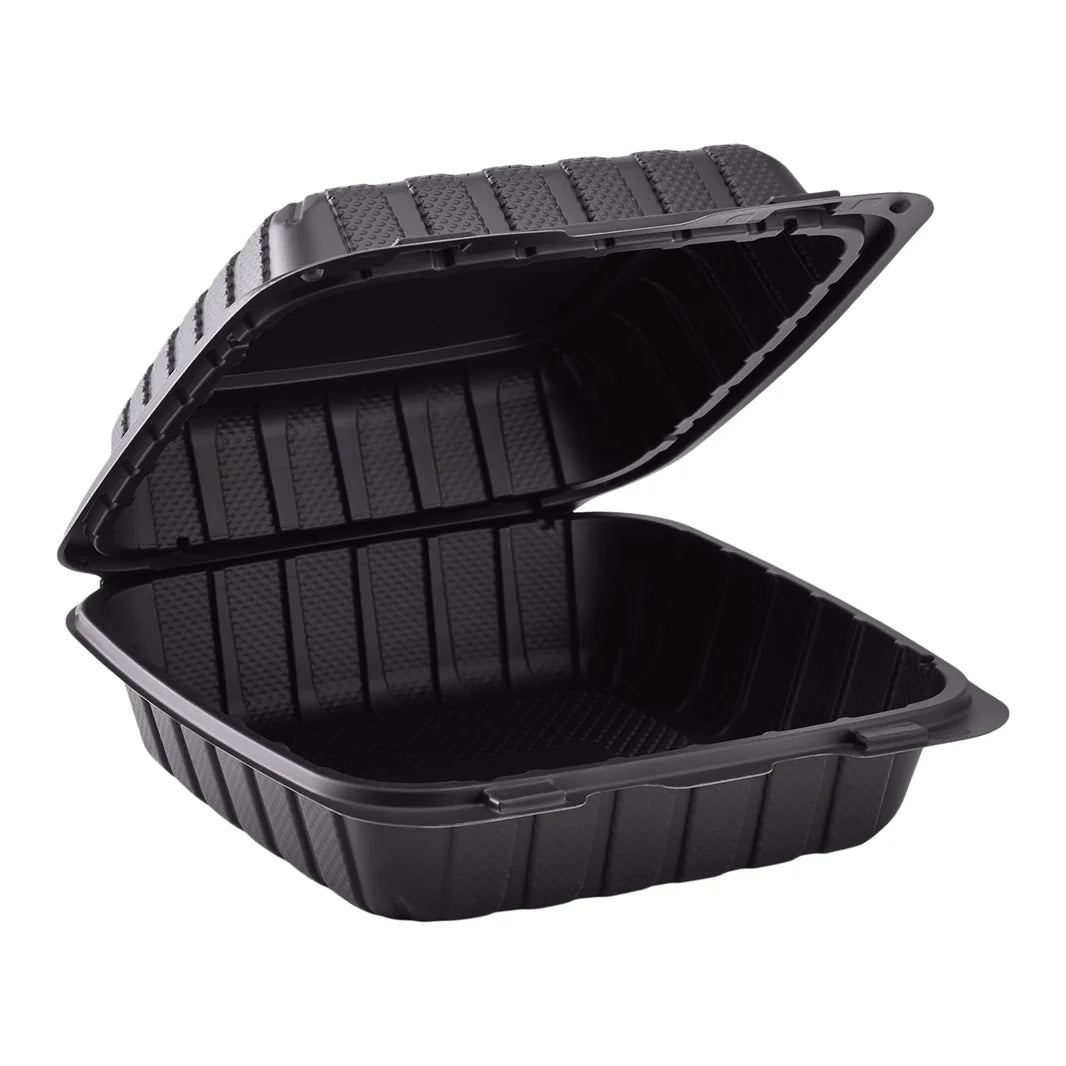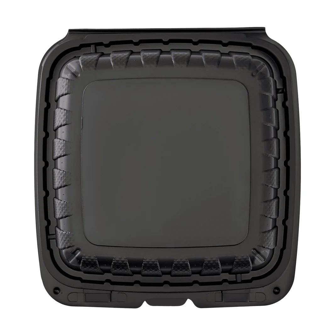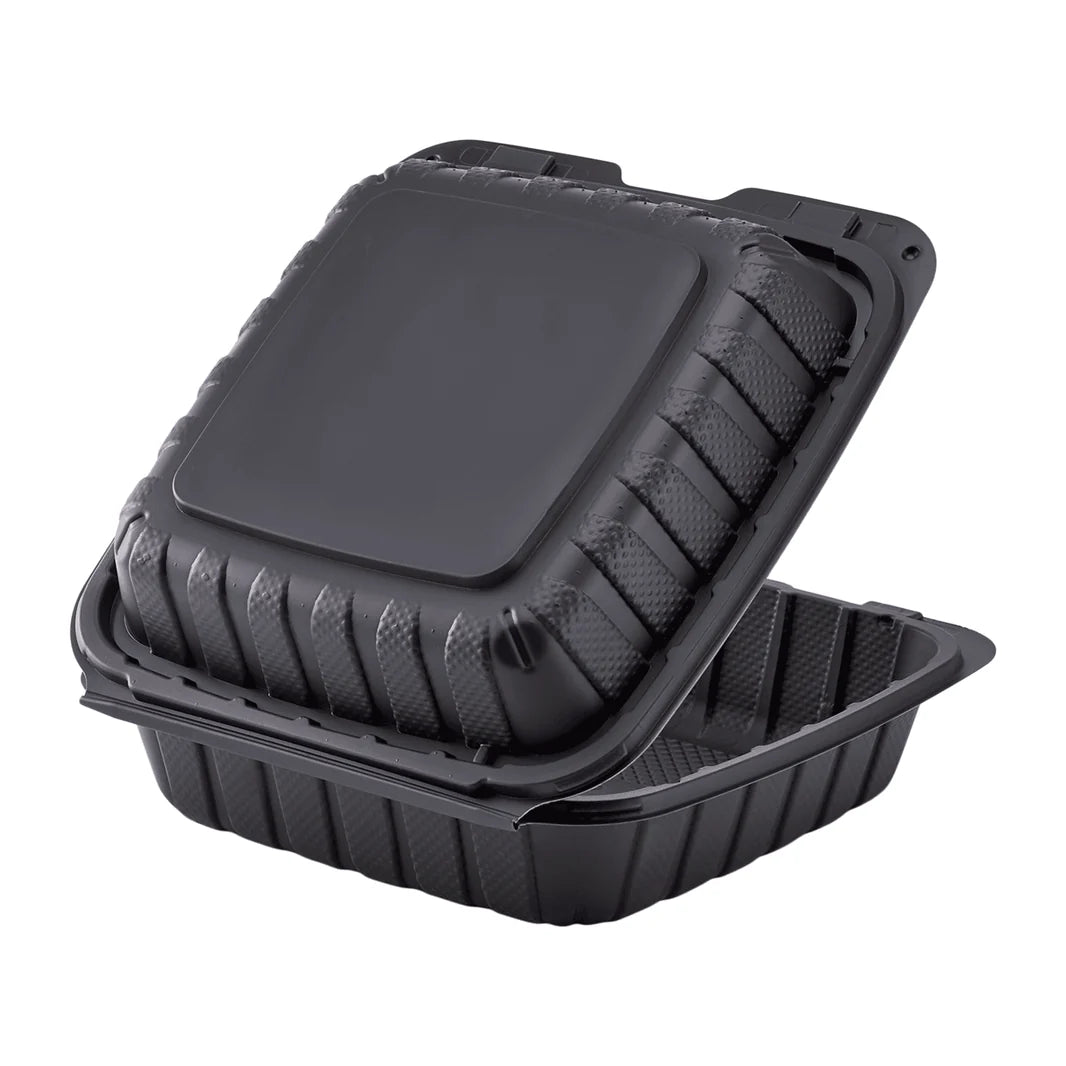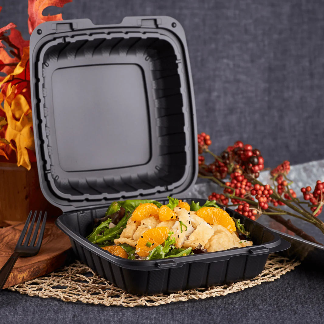 Introducing our 8"x8" Mineral Filled PP Hinged Container in sleek black. Made with durable PP material, this hinged container is perfect for storing leftovers or packing lunches. Keep your food fresh and safe with this reliable product.