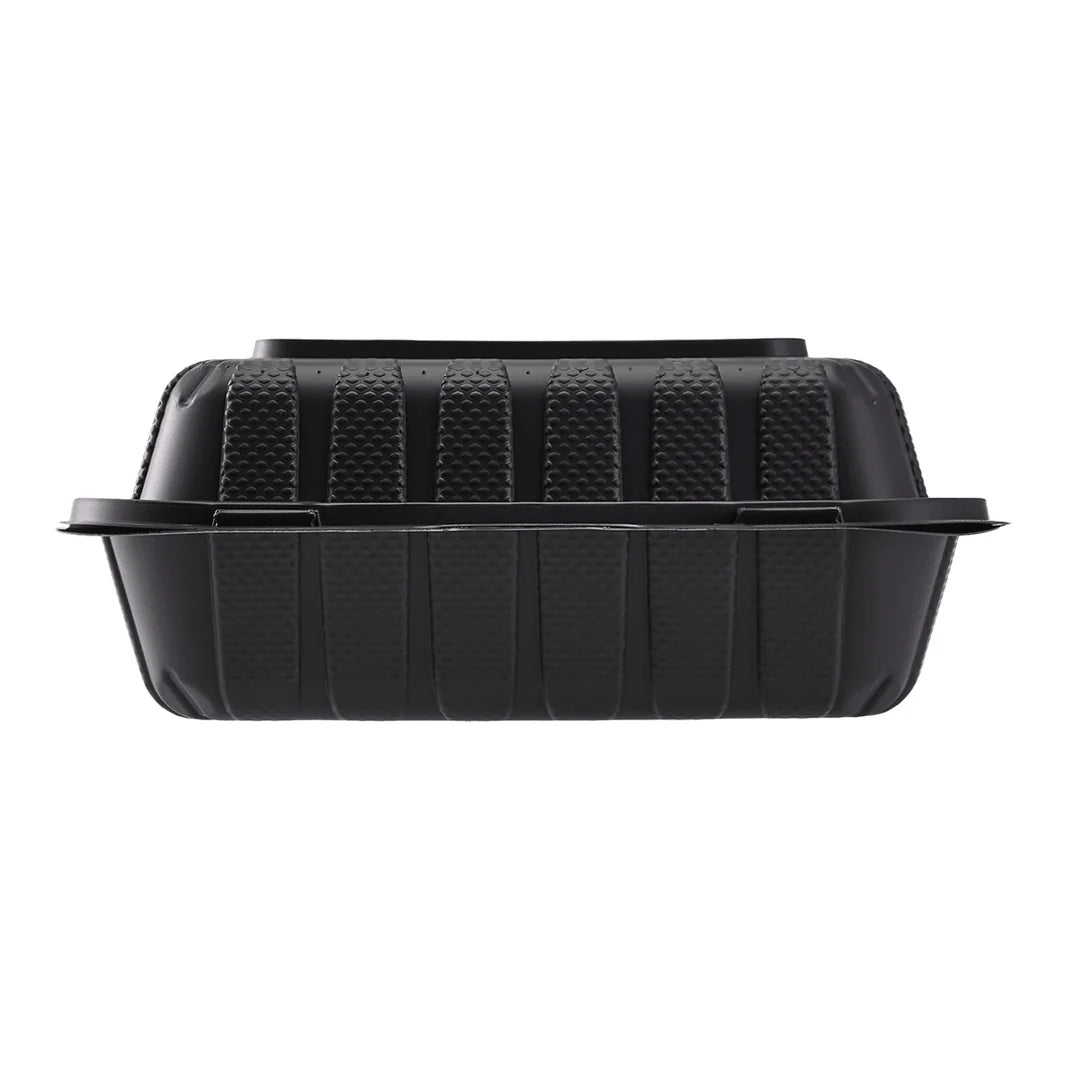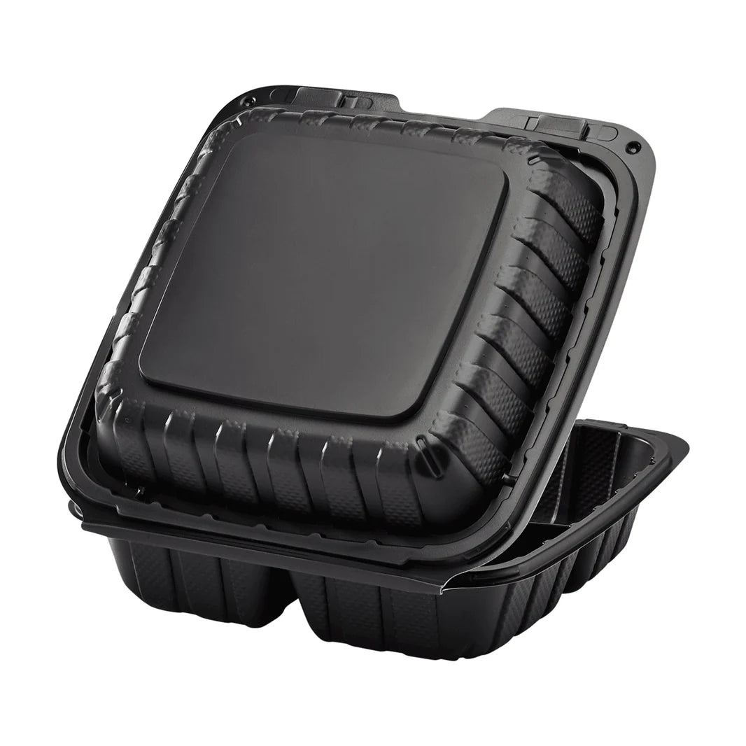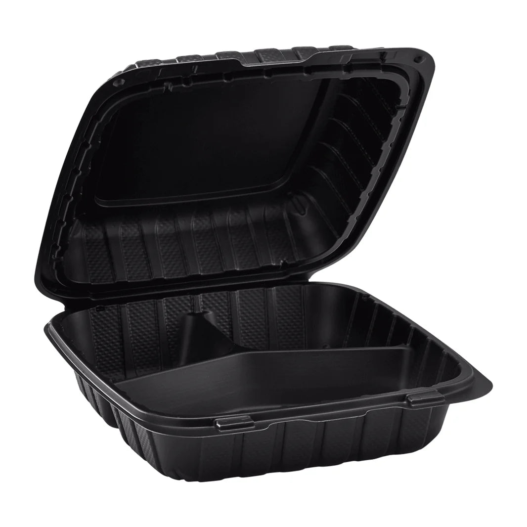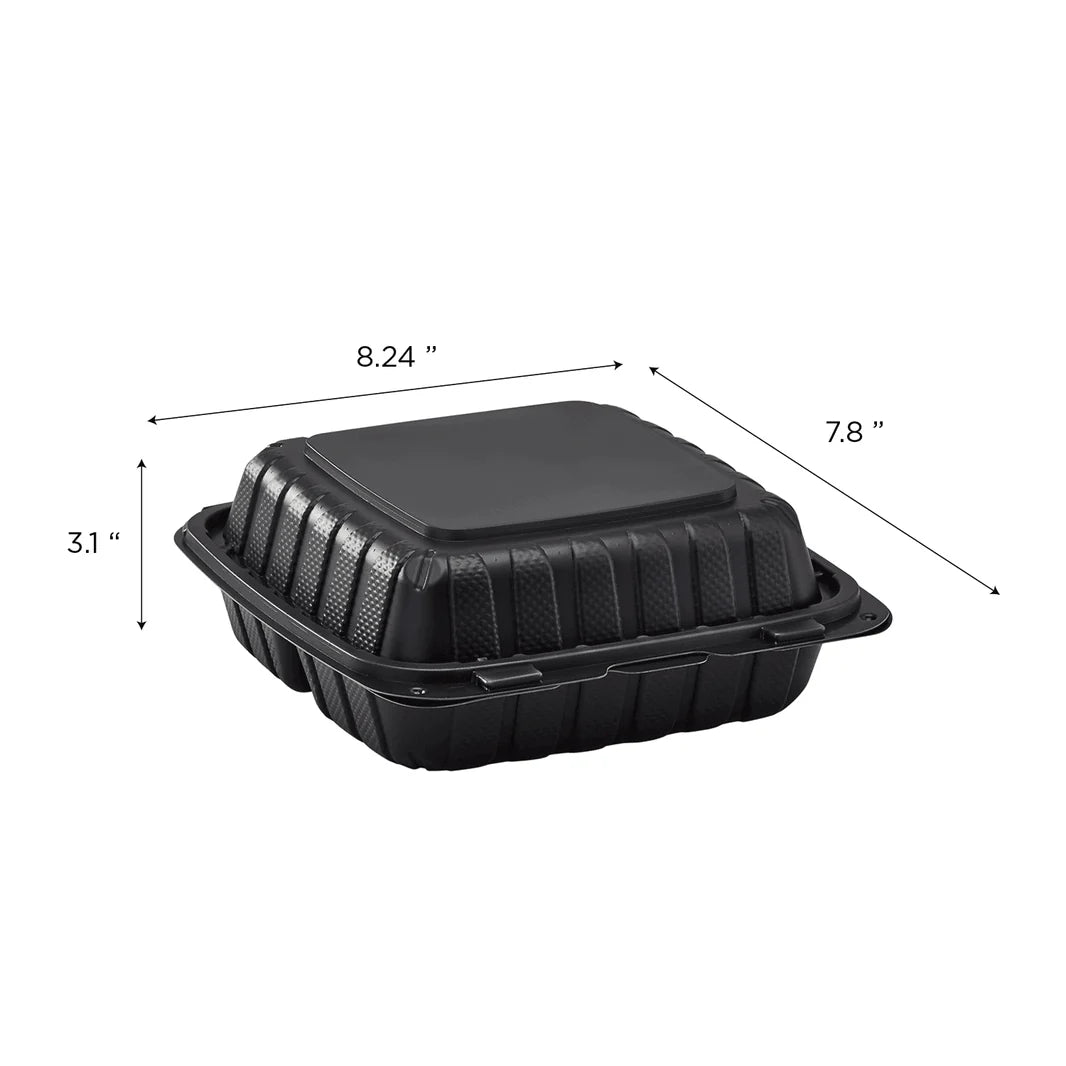 Efficiently store and organize your meals with our 8" x 8" Mineral Filled PP Hinged Container. Made with durable PP material, this container features 3 compartments for convenient portion control. Keep your food fresh and secure with the hinged design. Available in sleek black.