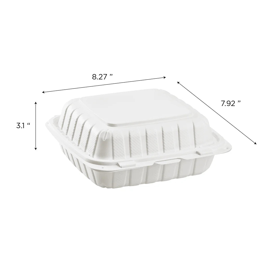 Introducing our versatile 8" x 8" Mineral Filled PP Hinged Container in white! This container is made of durable PP material and features a convenient hinged lid for easy access. Perfect for storing and transporting a variety of items, making it a must-have for any household or business.