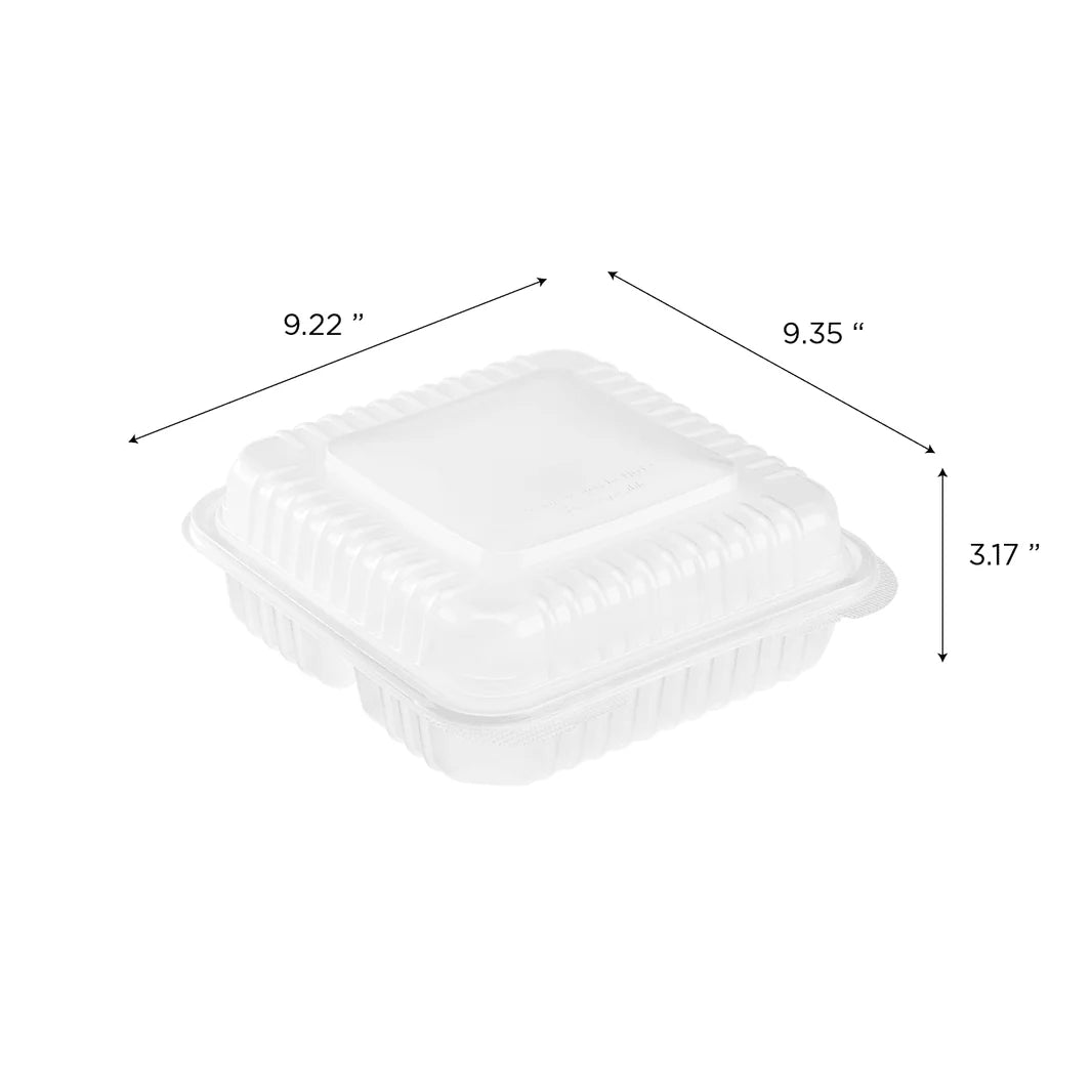 Introducing our 9" x 9" PP Plastic Hinged Containers with 3 compartments. Made from durable PP plastic, these hinged containers are perfect for storing and organizing food. The 3 compartments allow for easy separation of different items, making meal prep and on-the-go lunches a breeze. Upgrade your food storage game with these containers today!